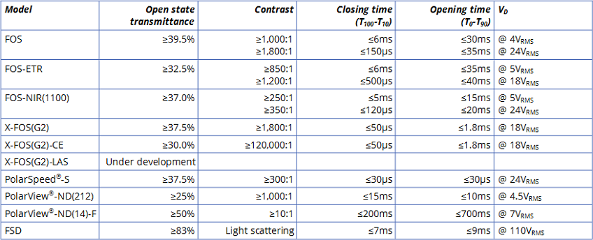 In order to meet a wide range of requirements for various applications, a series of shutter models possessing different electro-optical properties are offered in a number of standard sizes, all available with short lead times. Customers not finding their required shutter properties are advised that further optimization and custom designing are possible, both in terms of electro-optical properties and mechanical dimensions (up to 14”x16” size). As regards volume supply, any number from a single prototype up to several million units per month can be shipped.