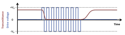 The shutters possess mono-stable normally white operation, without voltage applied the shutter is in its fully open, light-transmitting state*. Applying the drive voltage, VD, switches it to a closed, light-absorbing state**. This voltage must be kept throughout the duration of the time the shutter is required to be in the closed state. In general, increasing the drive voltage amplitude increases the contrast and shortens the closing time. The transmittance of the shutter reacts to the RMS voltage. In order to prevent ion migration within the LC layer that might impair shutter performance and lifetime, it is recommended to ensure that there is no net DC bias present in the drive signal. This is best achieved via use of one of the two AC square waveforms illustrated below. When the left alternative is used, the recommended minimum frequency is 60Hz if visual flicker is to be avoided. The right option is suitable when cycled operation between open and closed states is desired.